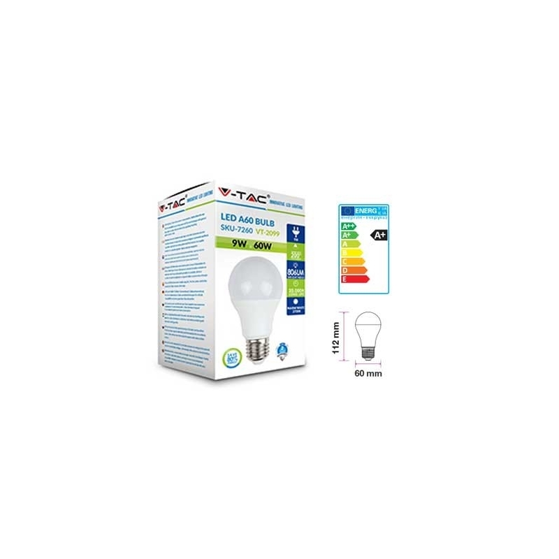 Lampadina LED V-Tac VT-2099 con potenza di 9W e attacco E27. Lampadina con tecnologia LED SMD, forma Bulb A60 in materiale termoplastico e copertura opaca. Fascio luminoso di 200°, flusso luminoso di 806 lm e un rapporto di 89 lm/W. La potenza di 9W è equivalente a 60W di una lampadina ad incandescenza.