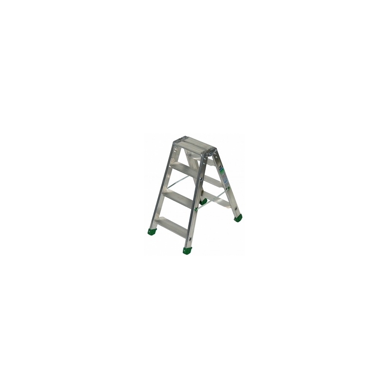 DUPLA SGABELLO tutto alluminio ad uso professionale. Gradini profondi 85 mm. Montanti scatolati 24 x 60 mm. Cerniere monoblocco in alluminio fuso. Compassi antichiusura/antidivaricamento in acciaio
