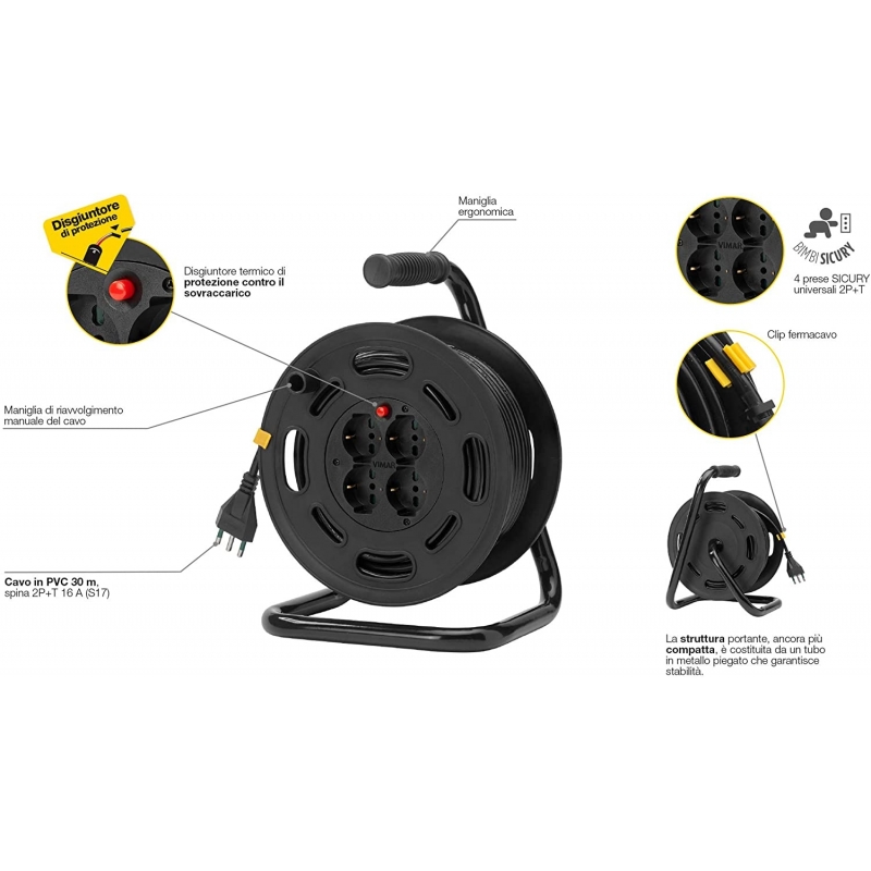 Avvolgicavo 2P+T 16 A 230 V~ con disgiuntore termico di protezione, 4 prese SICURY 2P+T 16A universali standard italiano P40, spina 2P+T 16 A standard italiano tipo S17, cavo H05VV-F 3G1,5 mm2 30 metri - Potenza massima prelevabile con cavo completamente avvolto 1200 W 230 V~, con cavo completamente svolto 2000 W 230 V~