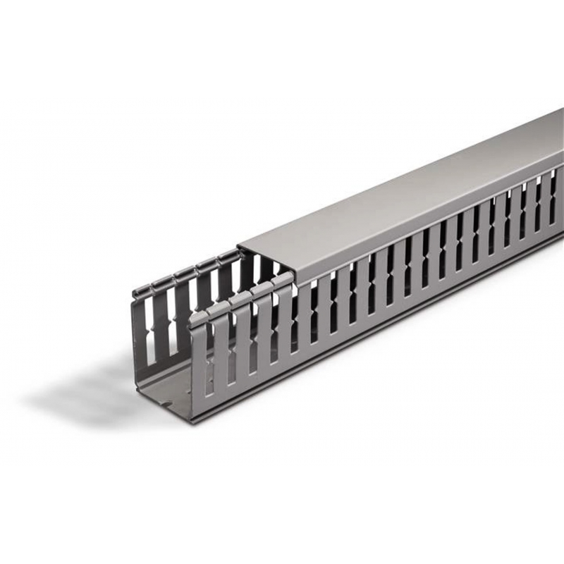 Canalina per cablaggio in materiale termoplastico isolante e antiurto, autoestinguente secondo Norma UL 94 V0 e resistente al calore anormale ed al fuoco fino a 960 °C (prova del filo incandescente) secondo Norma IEC 60695-2-11, senza piombo, colore grigio RAL 7030. Temperatura minima di immagazzinamento/trasporto -5 °C. Temperatura minima di installazione e d’uso -15 °C. Temperatura massima d’uso +60 °C. Resistente ad acidi, olii e grassi. Assenza di sbavature, spigoli interni arrotondati. Nuovo profilo delle lamelle per facilitare l’apertura e la chiusura del coperchio e garantire un aggancio più sicuro. Predisposta per aggancio a scatto su apposito accessorio adatto per l’attacco sia su guida DIN, sia su piastra di fondo. La tranciatura delle lamelle viene eseguita con un particolare processo di coniatura (arrotondamento degli spigoli) che permette di ottenere una canalizzazione assolutamente esente da bave e spigoli. Dimensioni e resilienza delle lamelle assicurano ripetute divaricazioni durante la fase di cablaggio. Divaricazione controllata dei fianchi per assicurare una perfetta tenuta del coperchio nelle tratte verticali e in presenza di alte temperature. Doppia linea di predisposizione alla tranciatura: una alla base delle lamelle per poterle asportare flettendole verso l’esterno ed una alla base della parete per potere tagliare il bordo quando si pongono due canaline in derivazione. Sagome fermacavi a metà del tratto rettilineo delle lamelle nelle canaline con altezze di 80 e 100 mm. Coperchio apribile senza attrezzo. Montaggio su superfici verticali o orizzontali anche con coperchio in basso. Campo di applicazione: industriale. Conformità alla Direttiva RoHS