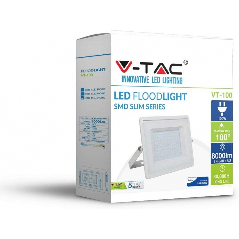 Faro LED V-Tac PRO VT-100 con potenza di 100W. Corpo ultra sottile in alluminio pressofuso di colore bianco con staffa e cavo di colore bianco e copertura in vetro trasparante. Proiettore con tecnologia LED SMD adatto all'uso esterno, grado di protezione IP65. Fascio luminoso di 100°, flusso luminoso di 8000 lm e rapporto di 80 lm/W. Il design slim, lo rende più leggero di un normale faro e più semplice da installare, oltre ad avere un'estetica più accattivante.