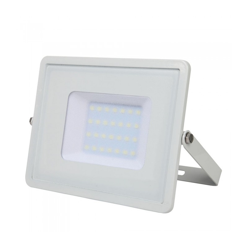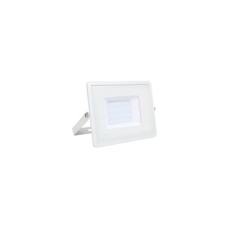 Faro LED V-Tac PRO VT-30 con potenza di 30W. Corpo ultra sottile in alluminio pressofuso di colore bianco con staffa e cavo di colore bianco e copertura in vetro trasparante. Proiettore con tecnologia LED SMD adatto all'uso esterno, grado di protezione IP65. Fascio luminoso di 100°, flusso luminoso di 2400 lm e rapporto di 80 lm/W. Il design slim, lo rende più leggero di un normale faro e più semplice da installare, oltre ad avere un'estetica più accattivante.