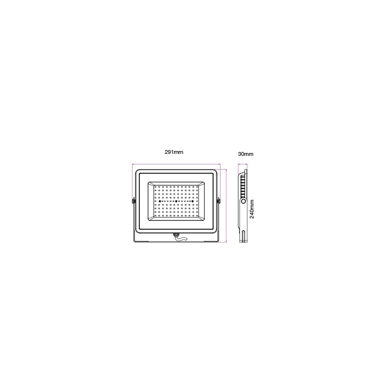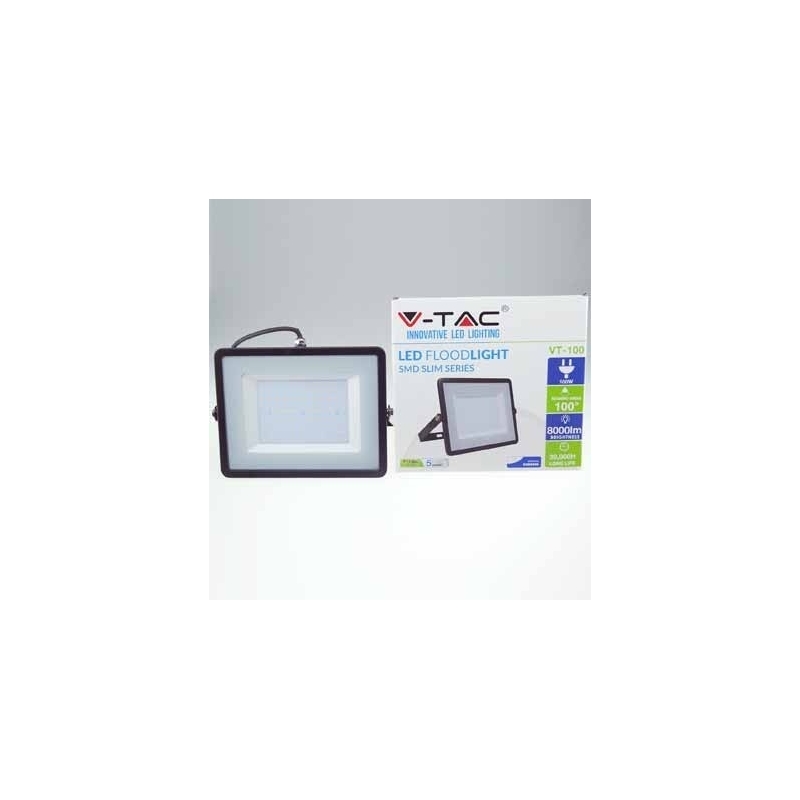 Faro LED V-Tac PRO VT-100 con potenza di 100W. Corpo ultra sottile in alluminio pressofuso di colore NERO con staffa e cavo di colore nero e copertura in vetro trasparante. Proiettore con tecnologia LED SMD adatto all'uso esterno, grado di protezione IP65. Fascio luminoso di 100°, flusso luminoso di 8000 lm e rapporto di 80 lm/W. Il design slim, lo rende più leggero di un normale faro e più semplice da installare, oltre ad avere un'estetica più accattivante.