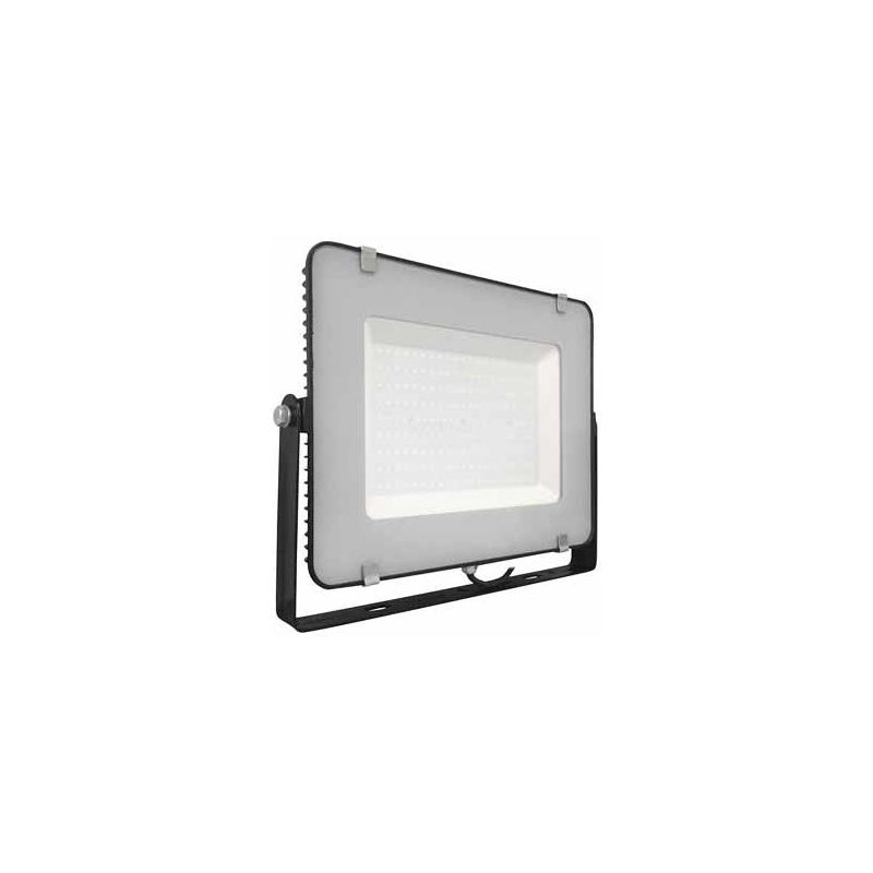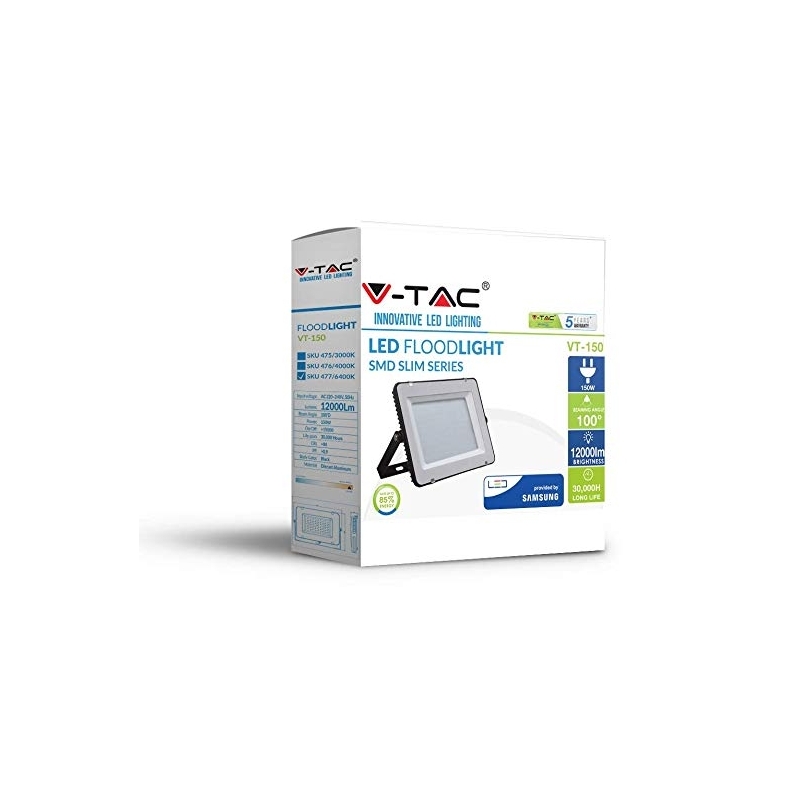 Faro LED V-Tac PRO VT-150 con potenza di 150W. Corpo ultra sottile in alluminio pressofuso di colore nero con staffa e cavo di colore nero e copertura in vetro satinata. Proiettore con tecnologia LED SMD adatto all'uso esterno, grado di protezione IP65. Fascio luminoso di 100°, flusso luminoso di 12000 lm e rapporto di 80 lm/W. Il design slim, lo rende più leggero di un normale faro e più semplice da installare, oltre ad avere un'estetica più accattivante.