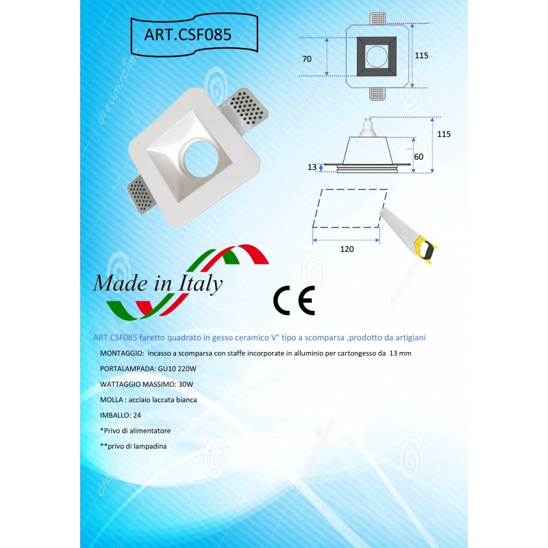 MATERIALE :GESSO CERAMICO LAMPADINE SUPPORTATE: GU10/MR16 POTENZA MASSIMA :50W TOTALI DIMENSIONI: CM.12 X CM.12 X h.6 Cm. PRODOTTO MADE IN ITALY,ALTAMENTE QUALITATIVO.