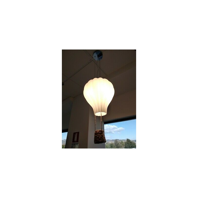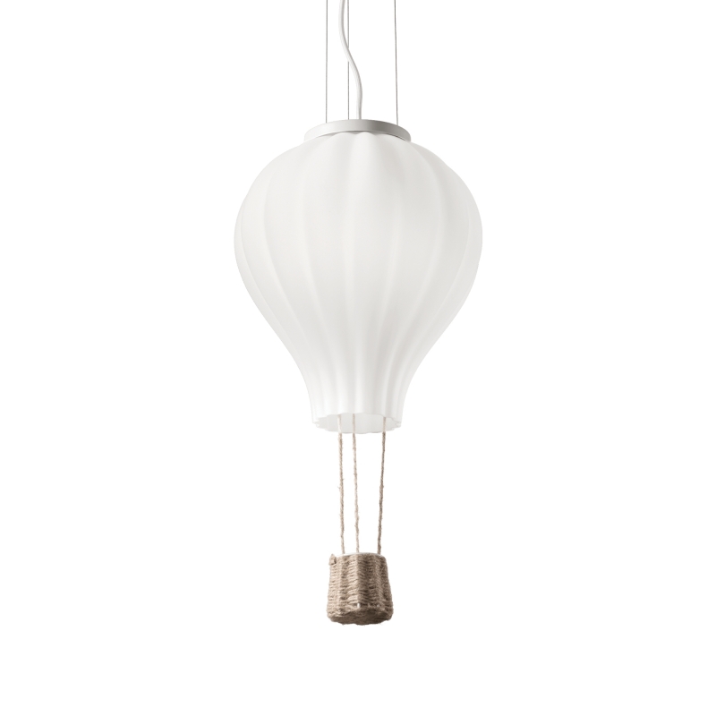 Rosone in metallo verniciato bianco opaco. Cavo in tessuto. Diffusore in vetro soffiato bianco acidato. Cesto in corda.