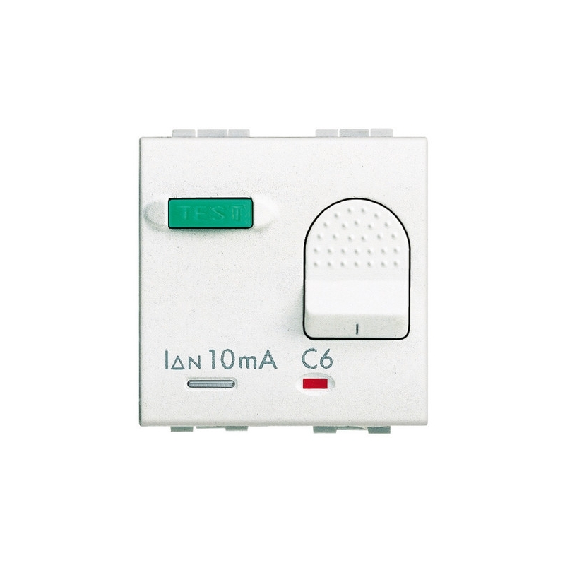Interruttore automatico differenziale (salvavita) bipolare con un polo protetto - I¿n 10mA - 16A 230 Vac - indicatore contatti aperti o chiusi - pulsante di test - potere di interruzione 3 kA - 2 moduli