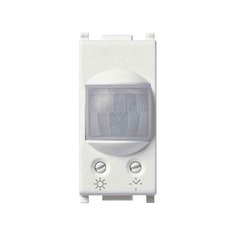 Interruttore con sensore di presenza ad infrarossi per accensione luci, soglia del sensore crepuscolare e ciclo di temporizzazione regolabili, uscita a relè NO 6 A 230 V~, alimentazione 230 V~ 50-60 Hz, bianco